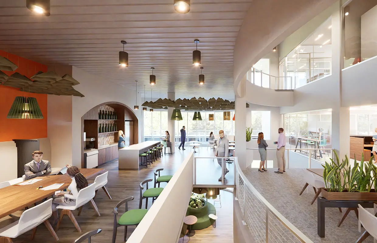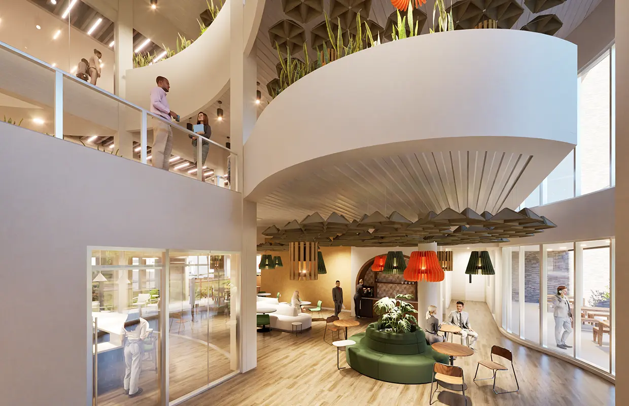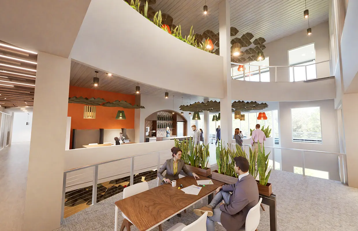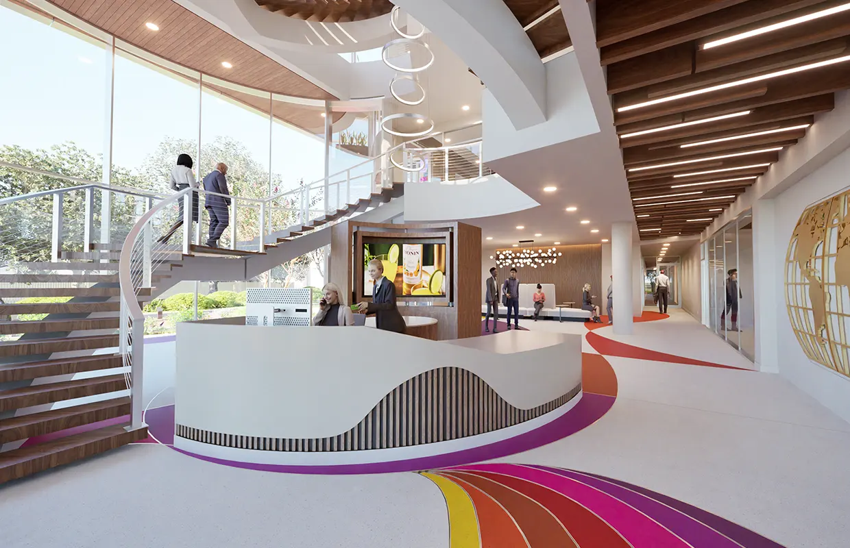 Monin’s new office building embodies the creativity of the flavor company throughout the new building, with the use of form and color. The curvilinear building embodies the nature of the Monin bottle. The building, designed to meet Platinum Well rating, uses sustainable technologies throughout ensuring the company that embodies the flavors of nature, also protects it. The interior design ignites creativity with undulating curves, helical stairs, flowers and flavor themed floors, that stimulate the eye. As you enter the site a flavor garden teases your nose.